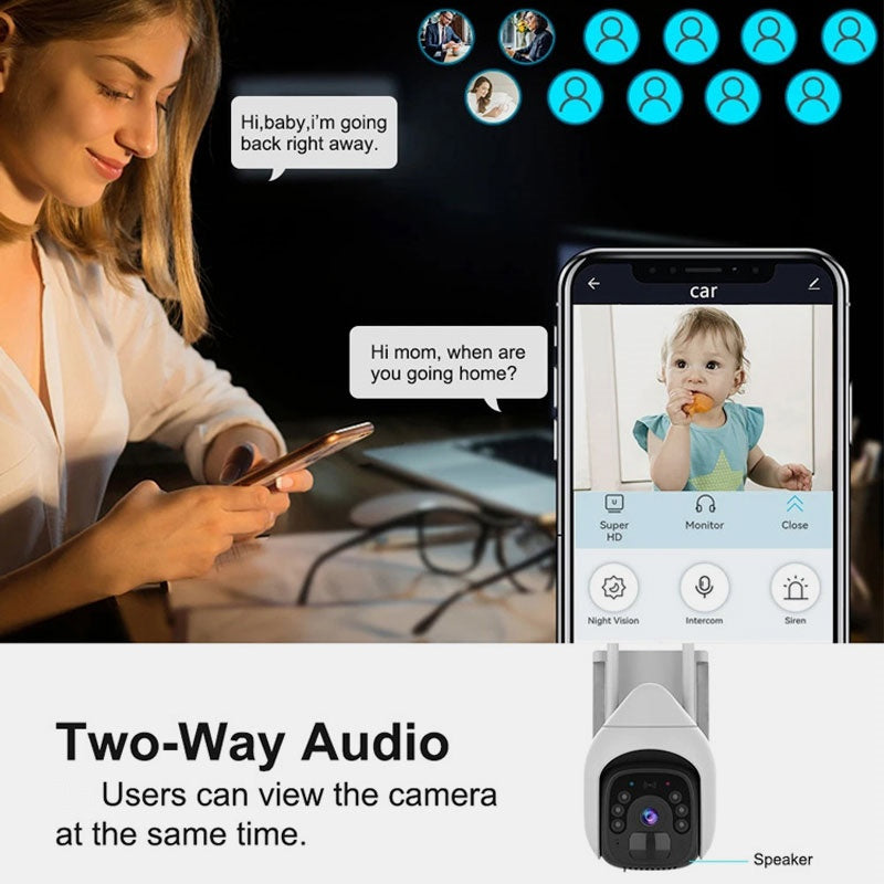 AUDIO FUNCTIONALITY: Receive instant notifications on your device when motion is detected, activating high-intensity white light and voice alerts. The built-in microphone enables clear two-way communication for remote family interactions.