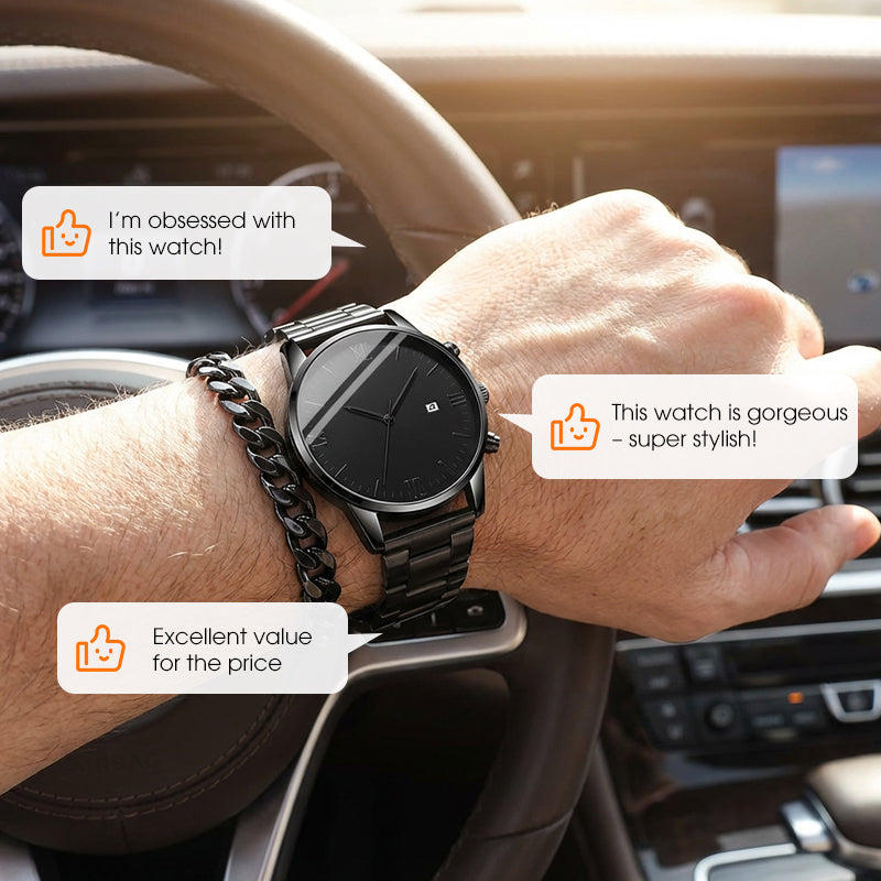 Men's Minimalist Quartz Watch with Date – All-Black Stainless Steel, Roman Dial & Precision Timekeeping! ⌚🖤