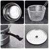 This set of saucepans includes a soup pot, lid, steamer, and strainer, so you can cook, boil, stew, fry, and steam as you like. No need to buy a bunch of pots anymore.