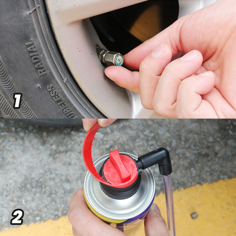 SIMPLE APPLICATION - Using our Emergency Flat Tire Repair and Inflator is straightforward. Start by cleaning any thorns or debris from the tire. If some thorns can't be removed, it won't affect the product's effectiveness. Then, open the tire valve cap, shake the product well, and remove the safety cover before use.